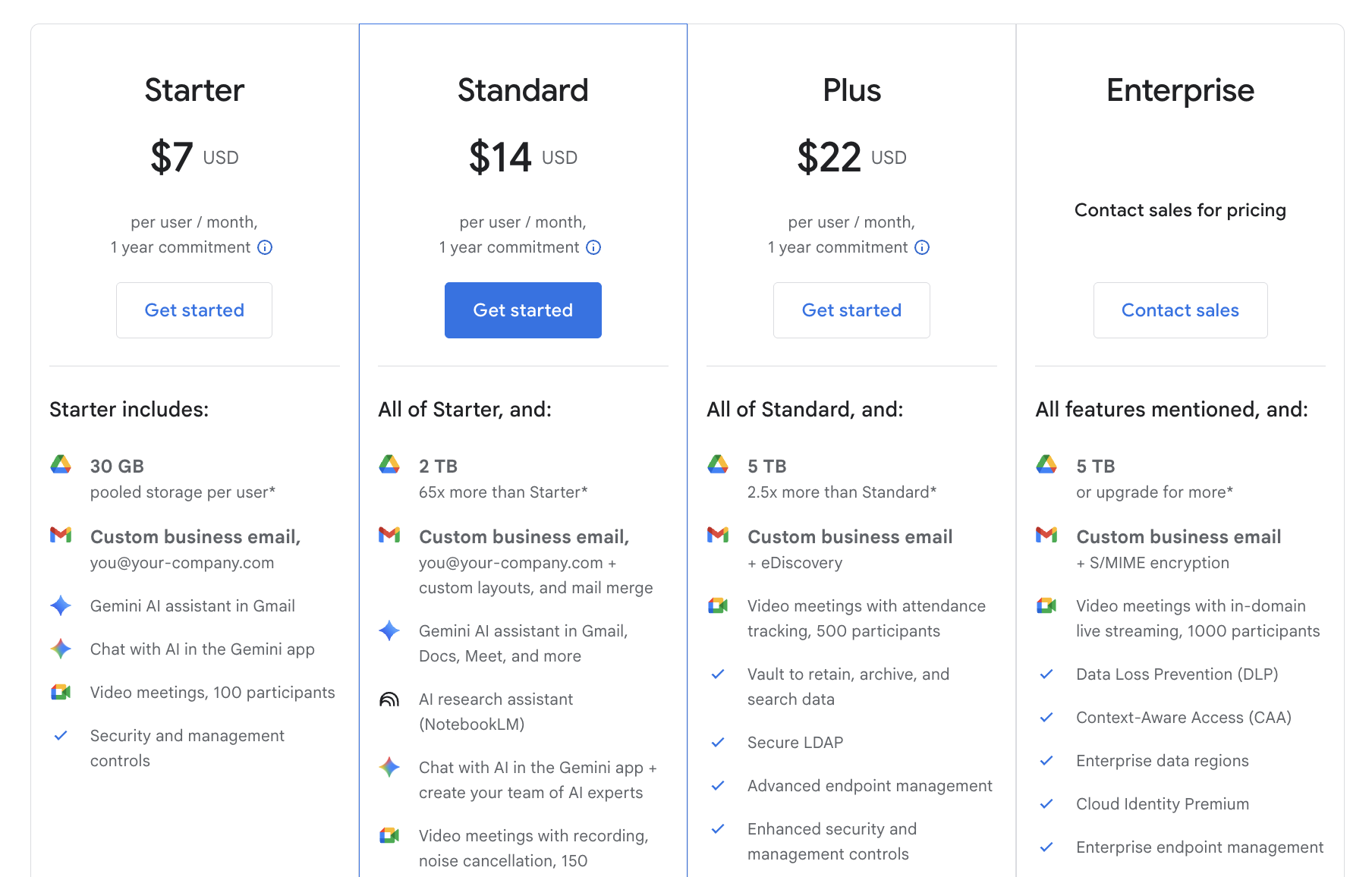 | Google Workspace | $7 USD per user/month (Starter) | $14 USD per user/month (Standard) | $22 USD per user/month (Plus) | Custom pricing (Enterprise) | 100% cloud-based with built-in collaboration and integrated Meet. |