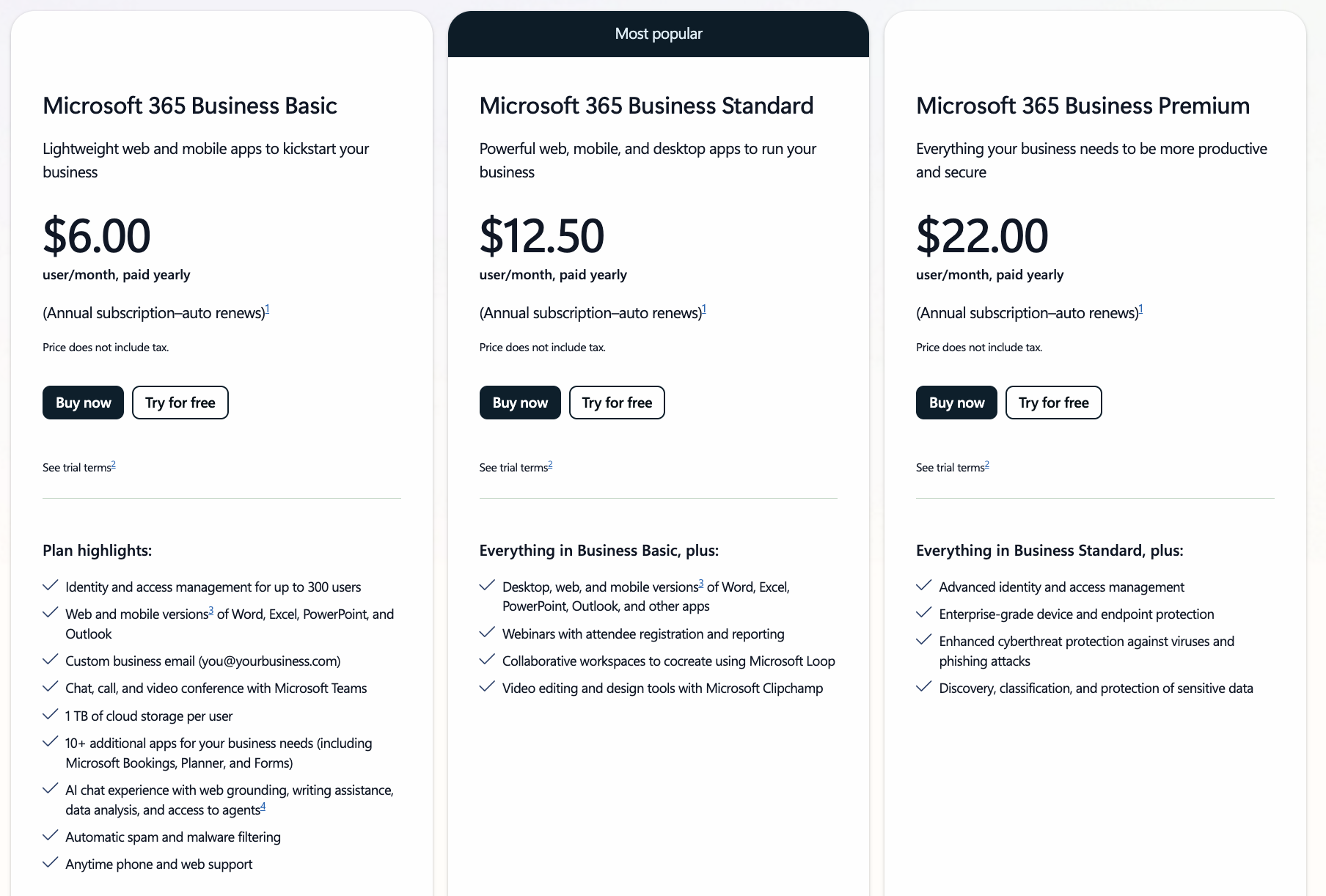 | Microsoft 365 | $6 USD per user/month (Business Basic) | $12.50 USD per user/month (Business Standard) | $22 USD per user/month (Business Premium) | Custom pricing (E3/E5) | Includes full desktop apps, Teams, OneDrive, advanced admin tools. |