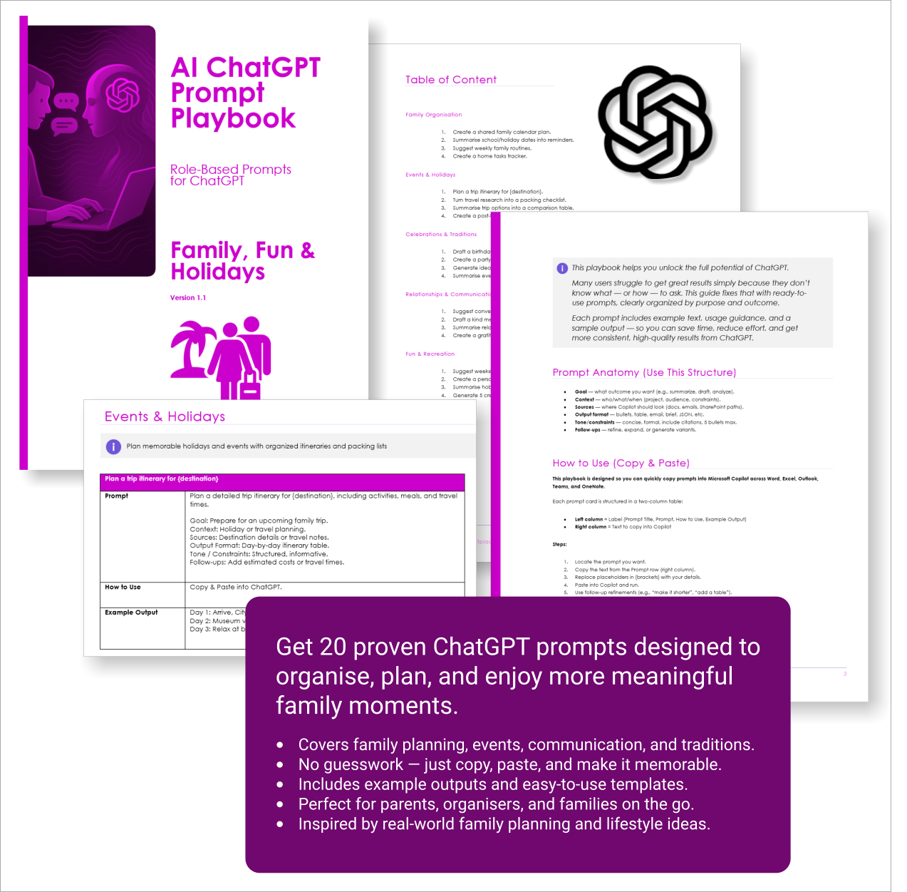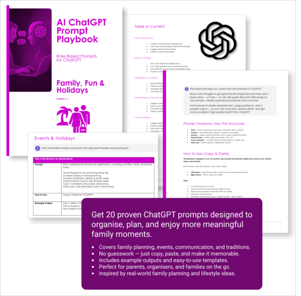 The ChatGPT Prompt Playbook for Family, Fun & Holidays (delivered as a downloadable PDF) gives you 20 proven prompts across 5 categories — helping you plan family routines, organise holidays, strengthen relationships, and make time for fun.