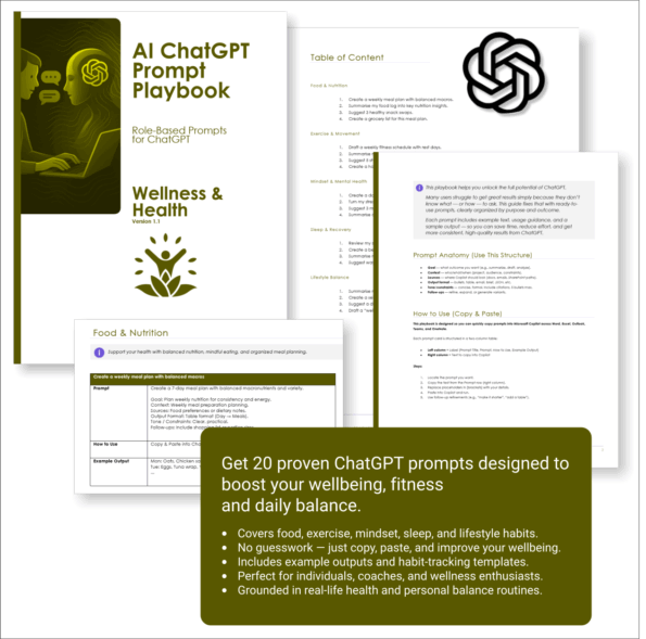 The ChatGPT Prompt Playbook for Wellness & Health (delivered as a downloadable PDF) gives you 20 proven prompts across 5 categories — helping you plan meals, move more, strengthen mindset, improve sleep, and build a balanced lifestyle.