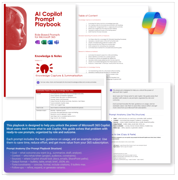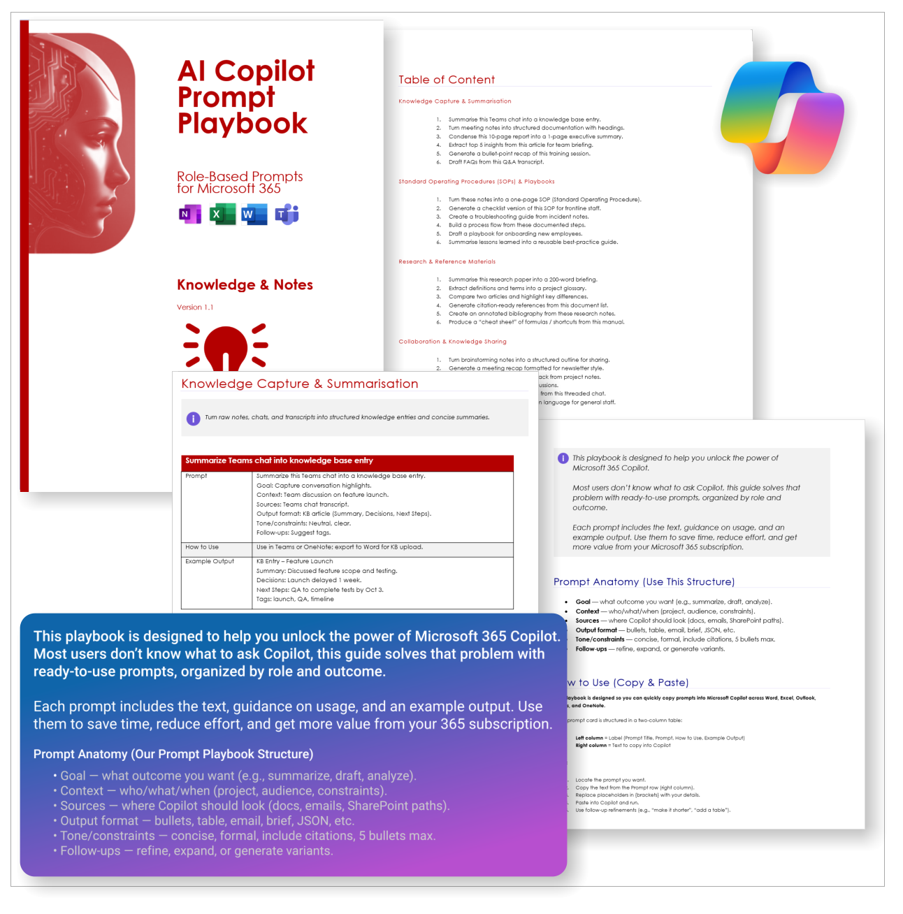 The AI Copilot Prompt Playbook for Knowledge & Notes (delivered as a downloadable PDF) gives you 30 proven prompts across 5 categories — helping you capture, structure, share, and organize knowledge more effectively inside Microsoft 365.