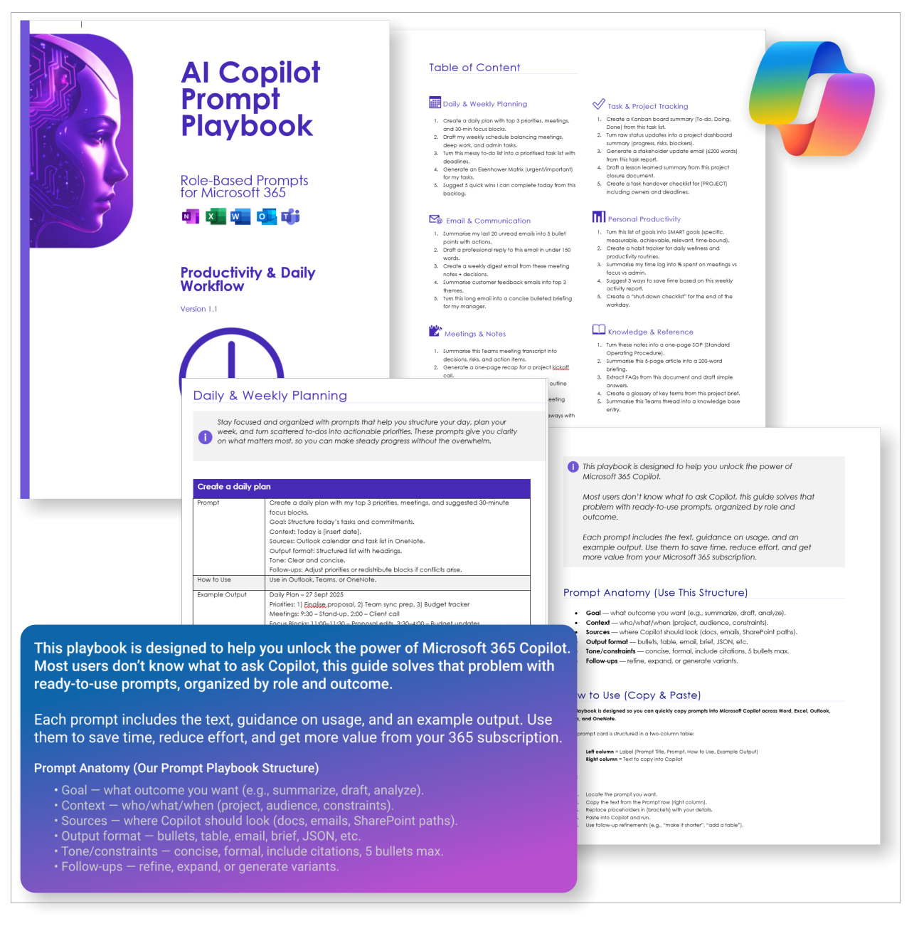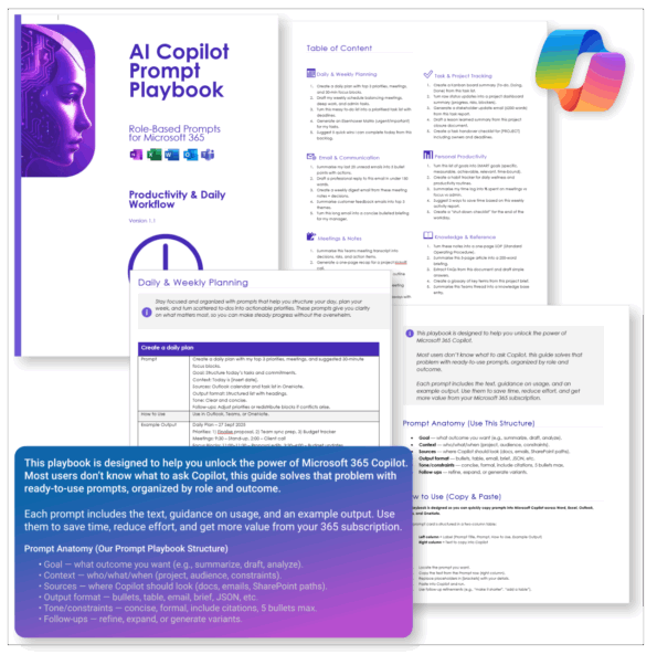 The AI Copilot Prompt Playbook for Productivity & Workflow (delivered as a downloadable PDF) gives you 30 proven prompts across 6 categories — helping you plan your day, manage tasks, streamline communication, and boost focus inside Microsoft 365.