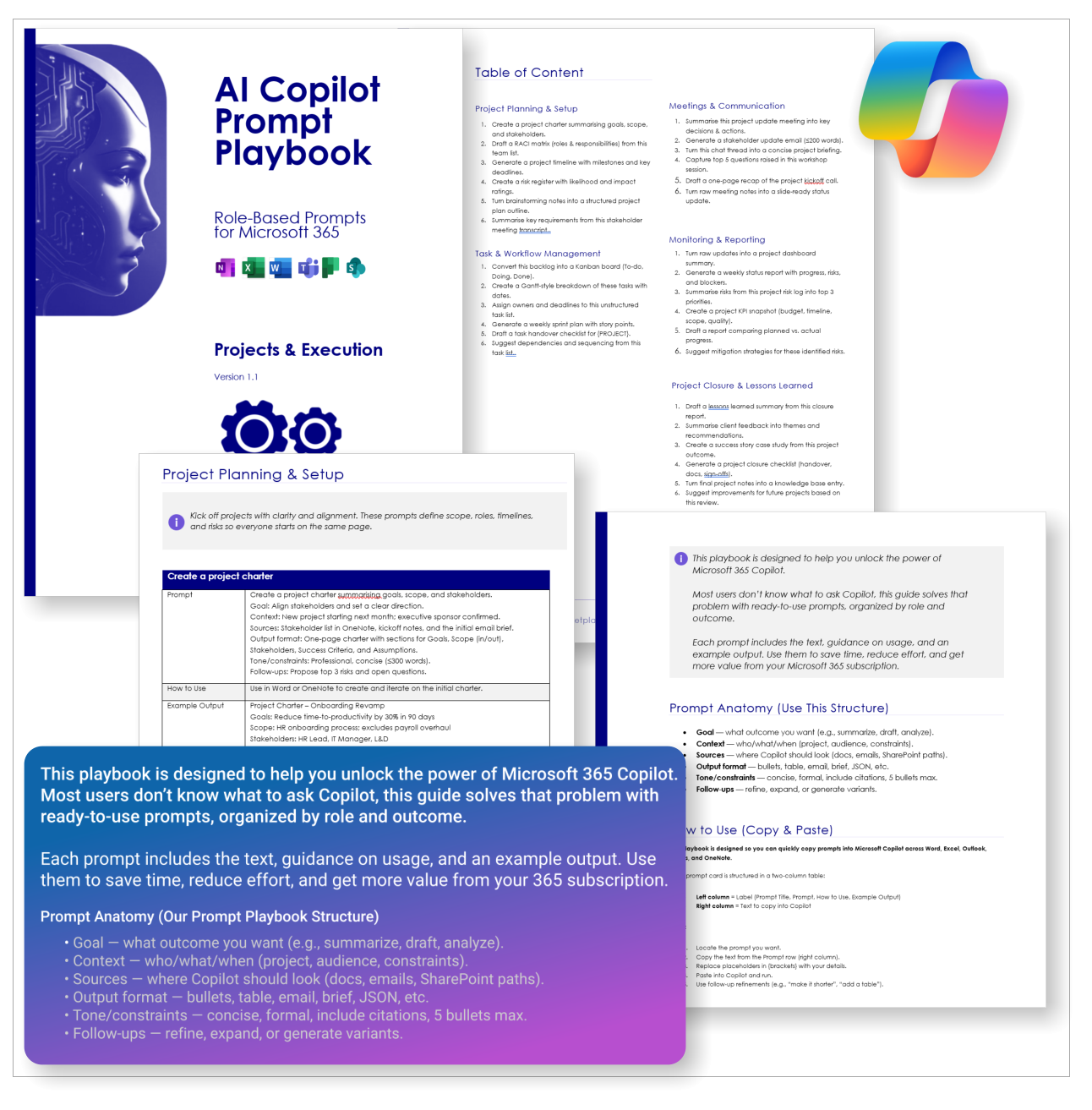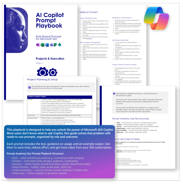 The AI Copilot Prompt Playbook for Projects & Execution (delivered as a downloadable PDF) gives you 30 proven prompts across 5 categories — helping you plan, track, communicate, monitor, and close projects with confidence inside Microsoft 365.
